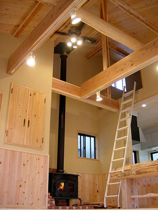 ですので2階全部が大空間のLDKです。光熱費がかかりすぎるだろうと薪ストーブを提案しました。