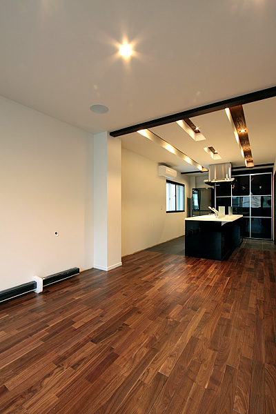 とてもシックな空間を演出してくれるブラックウォールナットのフローリング。