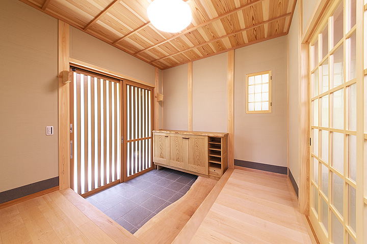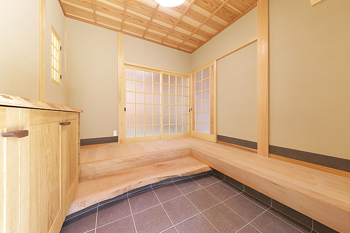 玄関框に板屋カエデ(メープル)の上框(品番:QM0203)を使用。 -