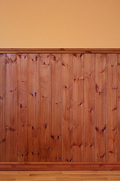腰壁にパイン羽目板(品番:PN1003)、パイン腰見切り材(品番:PN2001)、パイン巾木(品番:PN2003)に着色塗装したものを使用。