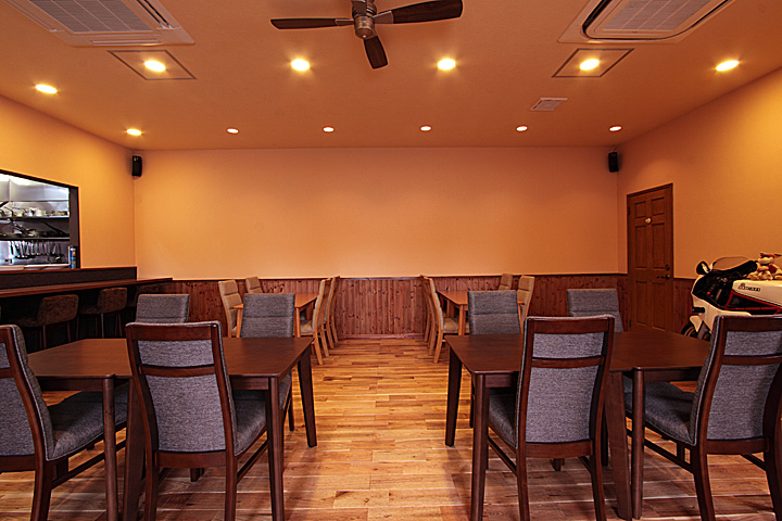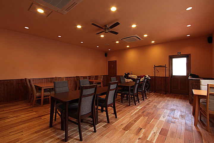 腰壁にはパイン羽目板(品番:PN1003)、パイン腰見切り材(品番:PN2001)、パイン巾木(品番:PN2003)に着色塗装したものを使用。
