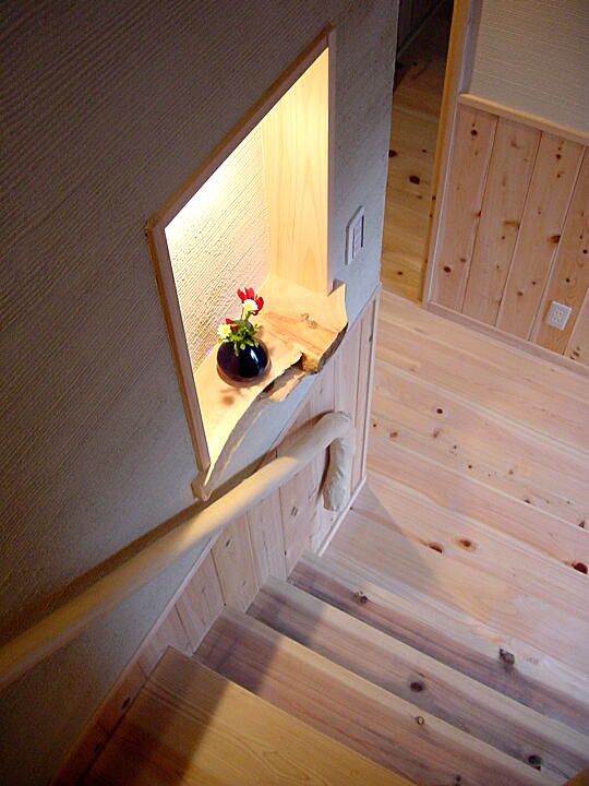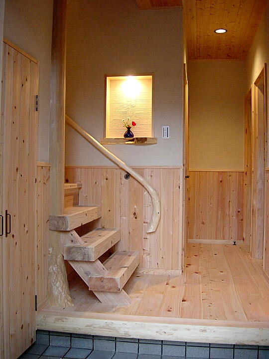 〔玄関〕丸太を太鼓に落とした上がり框、根付きの丸太柱、変木の手摺等が印象的です。