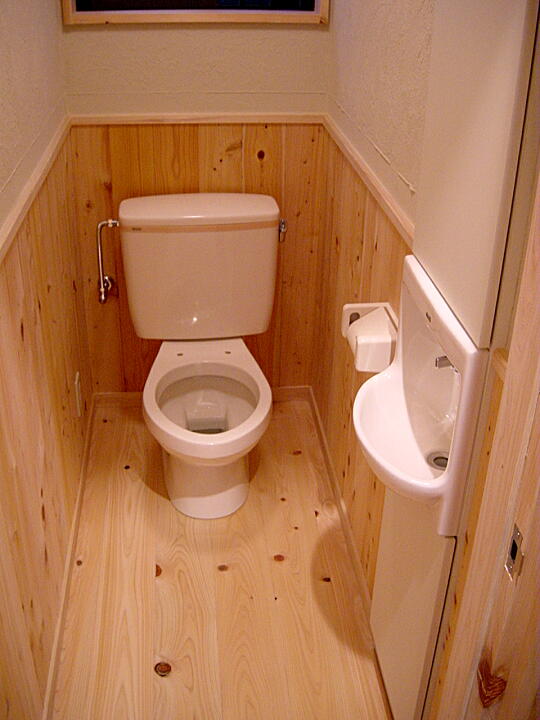 トイレも腰壁にサワラを使用しています。壁には珪藻土。嫌なにおいもさほど気になりません。この後に洗浄便座を取り付けました。