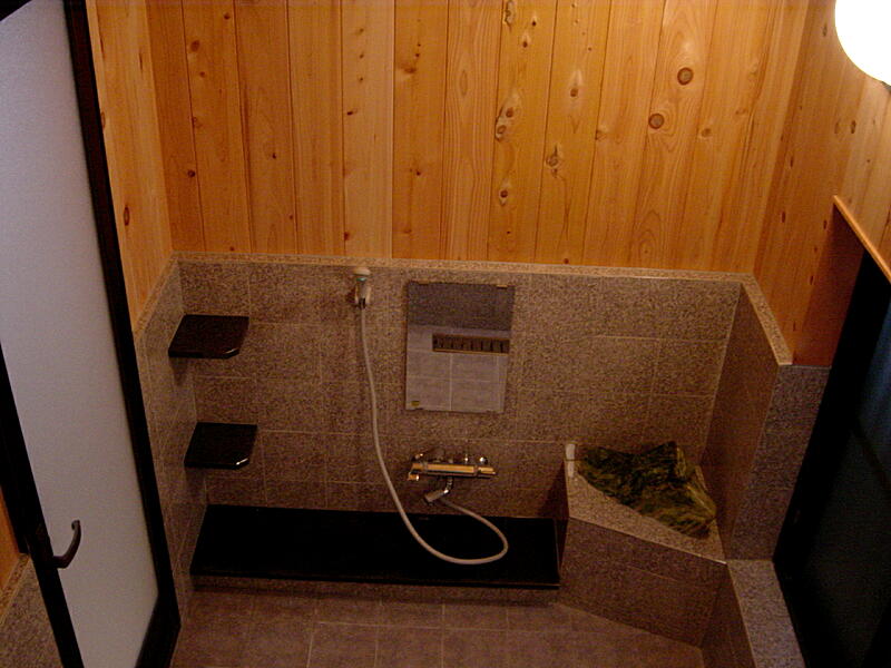腰までは御影石調タイル、それより上部の壁や天井はサワラを使用しています。