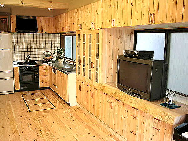 キッチンの扉をさわら材で作り直しました。吊戸棚をリビングの端まで設置。