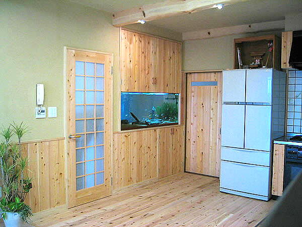 設計にあたっては無垢材を使用した床暖房、リビング・台所・玄関からみえる大きな水槽、