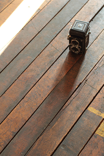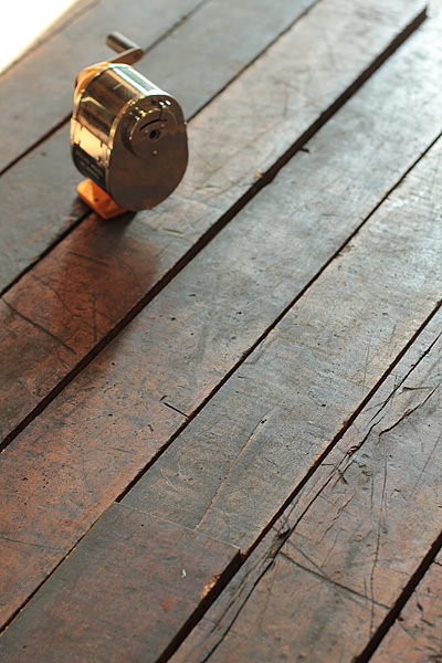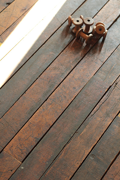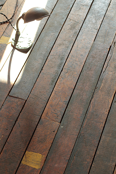 長年にわたり使用されてきた床材には、工具や金具で出来た傷やへこみ、割れや汚れ等、当時の雰囲気がたっぷりと残っています。いまだに当時の油分が表面に付着しており、その時代に戻ったかのような感覚です。